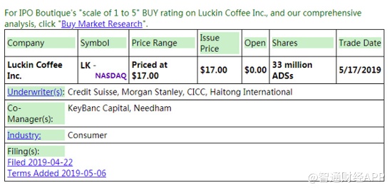 Boutique网站信息显示,瑞幸咖啡(LK.US)IPO发行价定在17美元/股,市值将达到42亿美元。瑞幸咖啡将发行3300万份ADS,将于5月17日在纳斯达克挂牌上市,交易代码为“LK”。