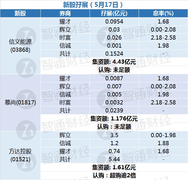 智通财经APP获悉,信义能源(03868)、慕尚(01817)和方达控股(01521)正在招股中,截至5月17日,辉立、耀才、时富以及信诚分别为其借出0.1524亿、0.0239亿和5.44亿。信义能源和慕尚孖展均未足额,方达控股超购逾2倍。