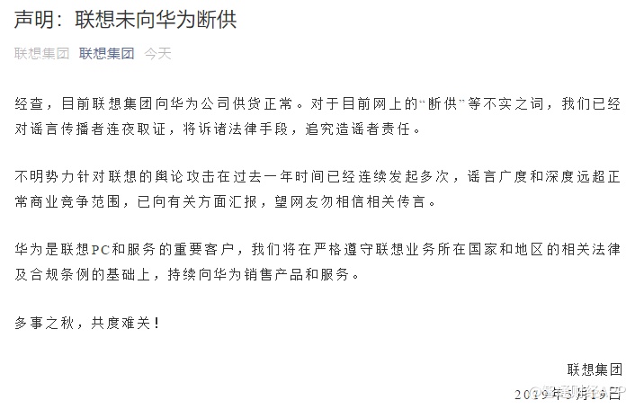 智通财经APP获悉,5月19日凌晨,联想集团(00992)官方微信公众号发布声明称,联想未向华为断供,目前供货正常。该声明还称,“华为是联想PC和服务的重要客户,我们将在严格遵守联想业务所在国家和地区的相关法律及合规条例的基础上,持续向华为销售产品和服务。”