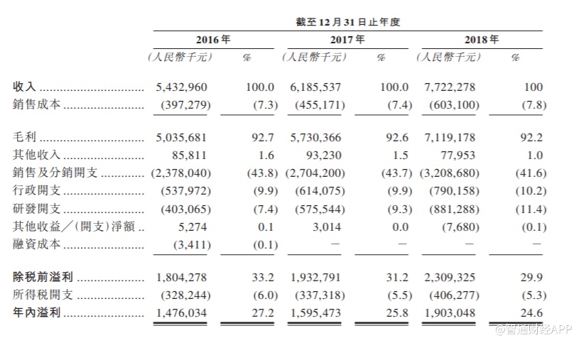 招股书显示,2016年至2018年,翰森制药实现收入54.33亿元、61.86亿元及77.22亿元;毛利分别为50.36亿元、57.30亿元及71.19亿元;毛利率分别为92.7%、92.6%及92.2%;净利润分别为14.76亿元、15.95亿元及19.03亿元;纯利率分别为27.2%、25.8%及24.6%。