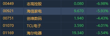 智通财经APP获悉,大市震荡,家电板块也连续多日调整,今日亦延续回调态势,截至发稿,志高控股(00449)跌6.98%,海信家电(00921)跌5.93%,创维数码(00751)跌4.43%,海尔电器(01169)跌3.54%。