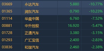 智通财经APP获悉,汽车经销商板块今日悉数走低,截至发稿,永达汽车(03669)跌10.77%,润东汽车(01365)跌10.23%,华晨中国(01114)跌7.52%,中升控股(00881)跌5.47%,正通汽车(01728)跌3.15%。