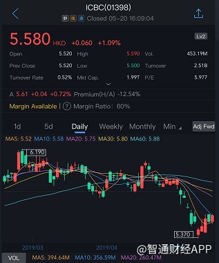 截至今日收盘,工商银行(01398)涨1.09%,报5.58港元。