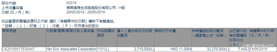 智通财经APP获悉,根据联交所资料显示,Van Eck Associates Corporation于5月14日增持雅生活服务(03319)271万股,每股作价11.1港元,总值约3008万港元,最新持股数目约3227万股,最新持股比例为7.44%。