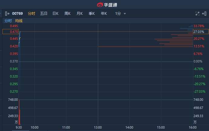 智通财经APP获悉,前期热门稀土概念股再获市场热炒,中国稀土(00769)早盘跳空高开高走,截至9时32分,涨27.03%,报0.47港元,成交额达672.1万港元。