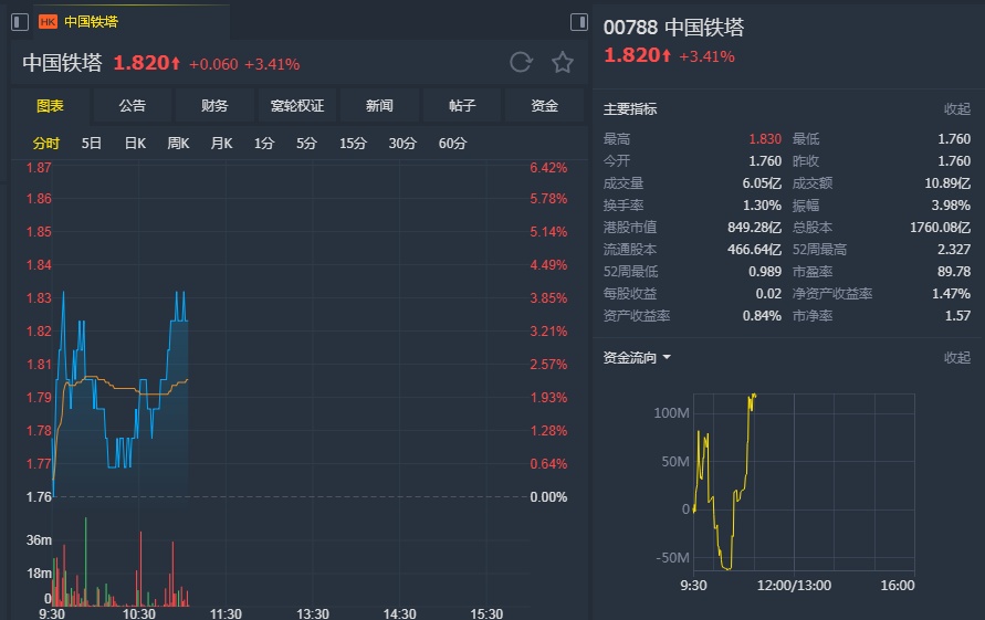 报告维持对中国铁塔盈测不变,预计其今明两年收入分别同比升7.7%及8.3%,纯利预计分别升91.9%及60.8%;并表示有关盈测未计入现时5G环境因素。中金还称,目前中国铁塔估值吸引,重申“推荐”评级,维持目标价2.5港元。