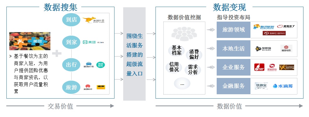 美团基于餐饮为主的商家入驻,为用户提供团购优惠与商家资讯,以获取用户流量积累。再围绕生活服务搭建的超级流量入口,进行数据价值挖掘,最终实现数据变现。