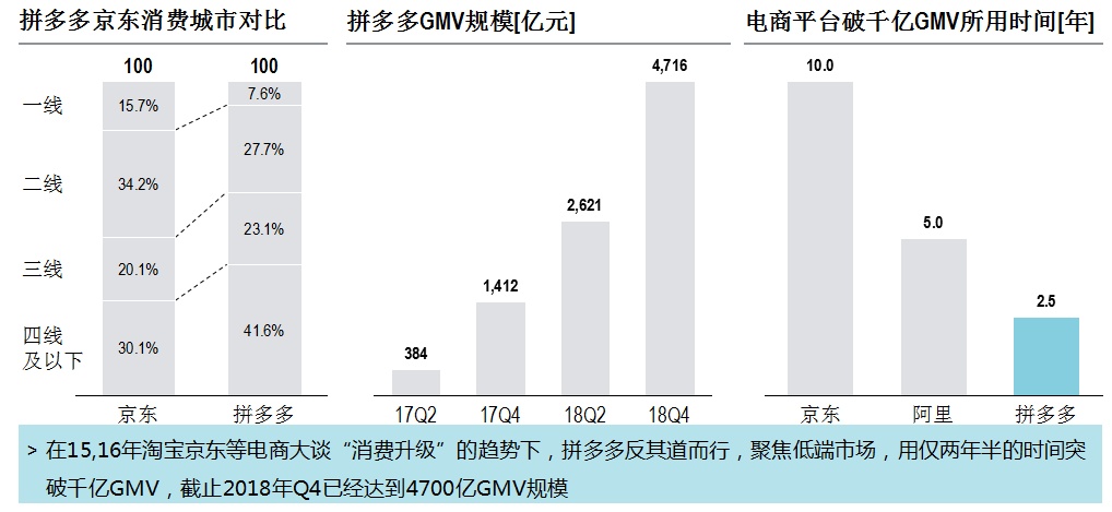 在底部整合方面,则有拼多多这样的案例。拼多多董事长黄峥曾说,“我们的核心五环内的人理解不了。”言外之意,拼多多的用户主要为收入不高的人群,即三四五线消费群体。可以说是无处安放的低端供应链和低销人群,其需求得到满足,最终撑起了拼多多。