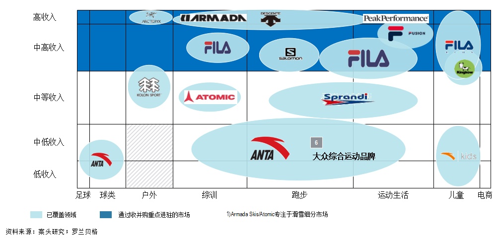 从上图可以看出,大众综合运动品牌安踏通过高性价比站稳了中低收入市场,并通过收购FILA中国区业务打入中高端市场。近期,安踏又瞄准了户外市场,引进迪桑特,并经营韩国品牌Konlonsport中国区业务。
