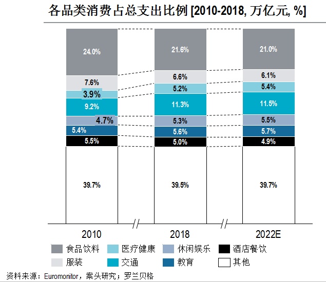 在这样的消费行为主导下,消费结构也由基础消费向服务性消费专业,未来教育、健康、娱乐等服务性消费将进一步变大,而食品饮料、服装等基础物质消费支出占比则会逐渐缩小。而这一改变源自于消费升级,收入上升使人们更加注重精神和健康需求,服务性消费向节约时间、提升体验两大方向升级,基础物质消费朝着健康化、舒适化及智能化方向发展。