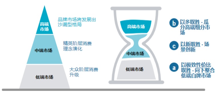 同时,大消费领域的市场结构也转变为“沙漏”型,即以做多、创新场景摄取高端细分红利,在低端市场则以性价比挤占市场规模。如瓜分高端细分市场的安踏(02020)、在下沉市场中取胜的拼多多(PDD.US)、借助极致性价比扩张的小米(01810)。