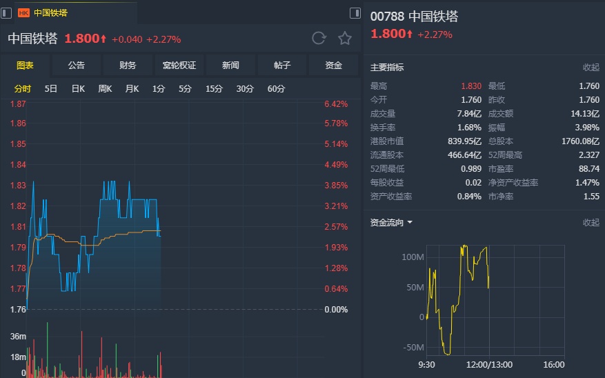 智通财经APP获悉,瑞信发表报告称,中国铁塔(00788)近三个交易日股价已累跌14%,但该行认为,从长远而言,5G发展仍会积极进行,相信中国铁塔未来数年仍为网络升级的受惠者。