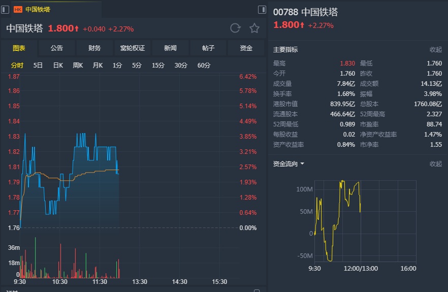 智通财经APP获悉,大摩发表报告称,中国铁塔(00788)目前估值仍吸引,维持“增持”评级,目标价2.5港元。