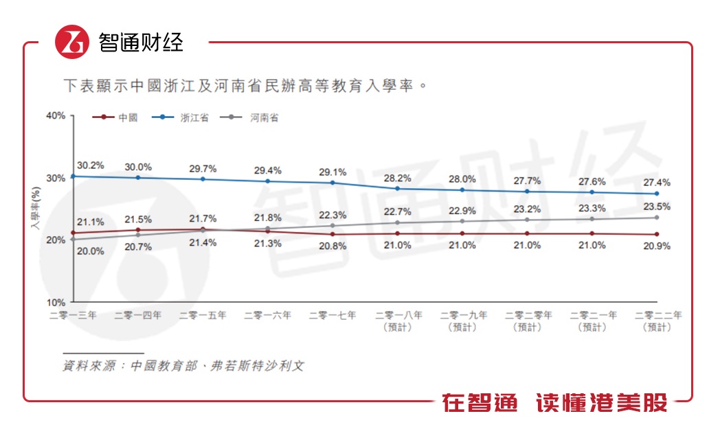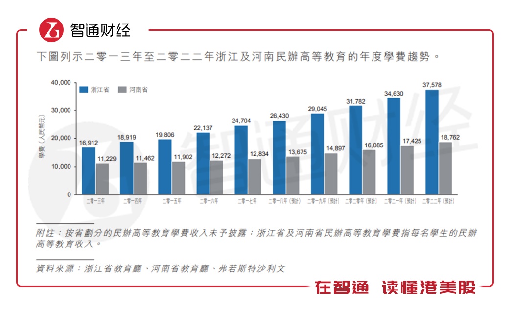 据招股书数据,浙江省及河南省民办高校学费标准已分别由2013年的16912元及11229元增至2017年的24704及12834元,复合年增长率分别为9.9%及3.4%。而从2017年到2022年,两省的民办高等教育学费标准的复合年增长率预期则分别为8.8%及7.9%,并将在2022年分别达到37578元及18762元。