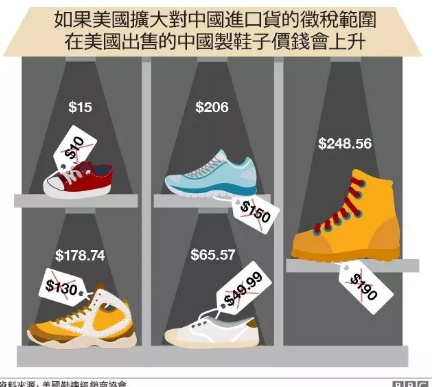 据美国鞋袜经销商协会(Footwear Distributors and Retailers of America)估计,在25%的高关税下,童鞋的平均售价会从10美元涨到15美元,跑步鞋会从150美元涨到206美元、篮球鞋会从130美元涨到179美元、靴子则会从原来的190美元涨到249美元,其他种类的鞋子也会出现类似的涨价情况。