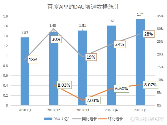 从数据上看,百度APP的DAU稳步增长,从2018年一季度的1.37亿增至2019年的1.74亿,同比增长28%。但值得注意的是,2018年第三季度时,百度APP的DAU无论是同比,还是环比增速均有所回落,且环比增速直接从8%下滑至2%,后两个季度才逐步回升。