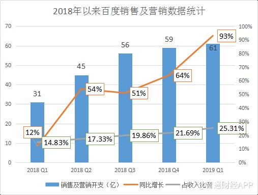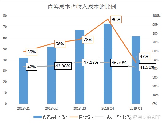 据智通财经APP了解,2019年一季度时,百度的收入成本为148.39亿元人民币,同比增长近50%。其中,内容成本为61.57亿元,同比增长47%,该成本的增加,主要由于爱奇艺的内容投资增加,以及百度信息流网络百家号的内容投资有所提升。