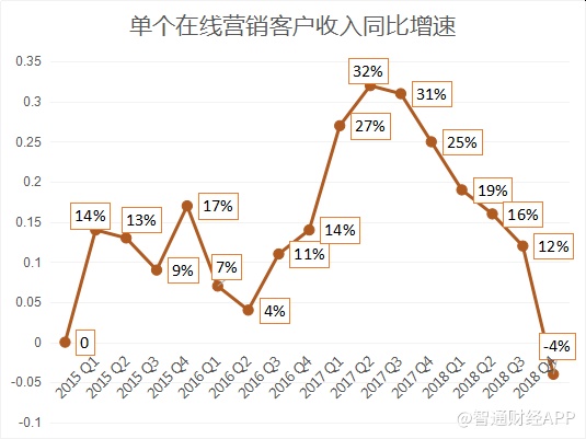 早在2017年第二季度时,百度的单个在线营销客户收入同比增速高达32%,是自2015年以来的最高水平。不过,在“魏泽西”事件后,监管不断加强,导致百度的搜索广告业务持续低迷,单个在线营销客户的收入同比增速不断下滑,至2018年第四季度时,已出现负增长。
