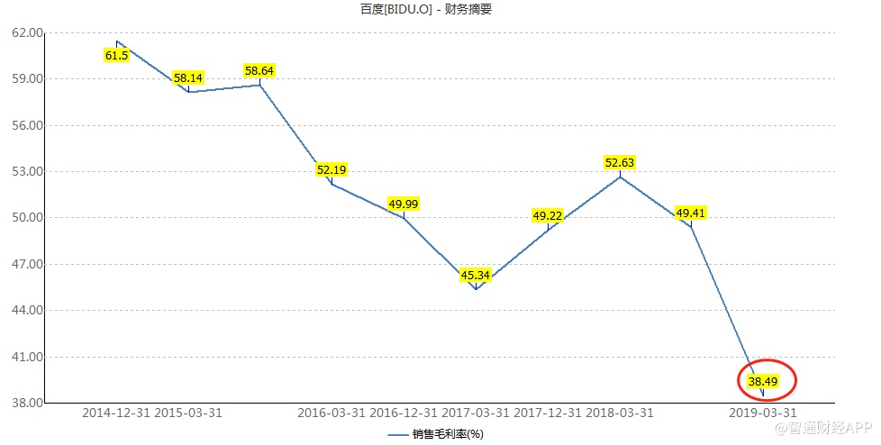 在总收入同比增长21%,收入成本增长近50%的情况下,百度的毛利率被快速压缩,从2018年全年的49.41%下降近10个百分点至38.49%,而在2018年一季度时,百度的毛利率高达52.63%。