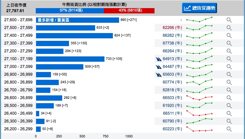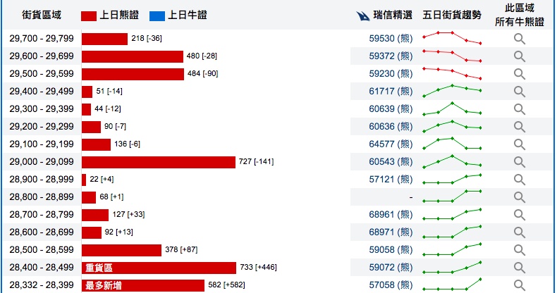 智通财经APP获悉,截至5月21日,恒指最新的牛熊街货比例57:43。瑞信恒指牛熊证街货分布图中的数据显示,熊证街货重货区在28400-28499区间,该区间最新熊证数量为733张,较上一交易日增加446张;最多新增区间在28332-28399区间,该区间最新熊证数量为582张,较上一交易日增加582张。牛证街货重货区在27600-27698区间,该区间最新牛证数量为890张,比上一交易日增加271张;最多新增区间在同一区间。