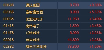 智通财经APP获悉,前期持续回调的手机设备股近两日回暖,今日延续反弹,截至发稿,通达集团(00698)涨9.38%,富智康(02038)涨5.32%,比亚迪电子(00285)、高伟电子(01415)涨超3%,瑞声科技(02018)涨2.28%。