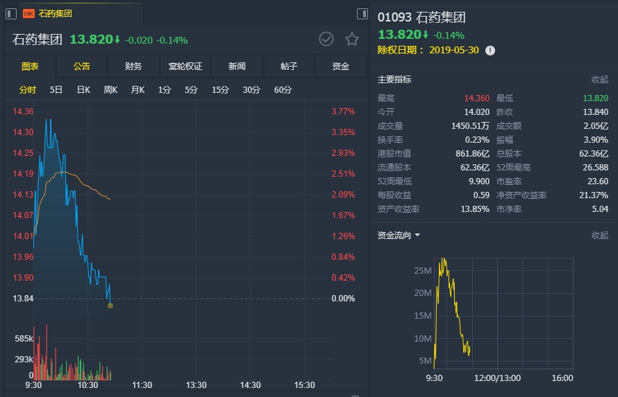 智通财经APP获悉,野村发表研究报告指出,石药集团(01093)首季业绩大致符合预期,增长动力主要来自恩必普(NBP)及抗肿瘤产品组合,现价市盈率约为2019年预测盈利的18倍,目标价维持17.3港元,即股价较昨日(21日)收市价仍有上行25%的空间,重申“买入”评级。