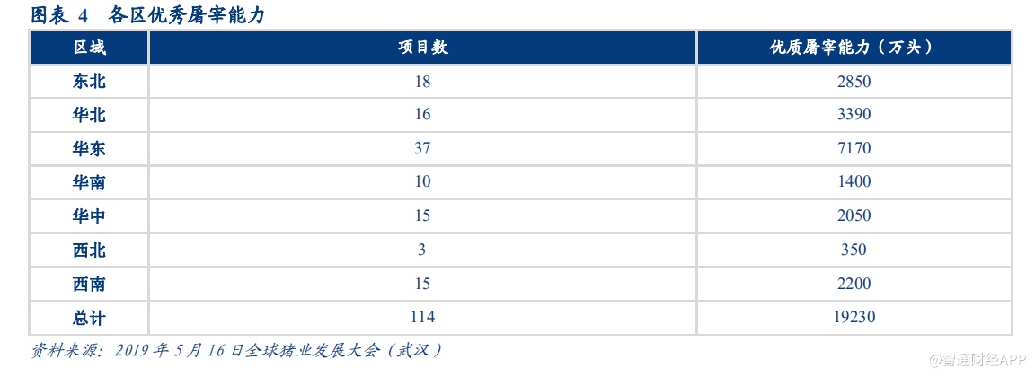 全国优质屠宰产能总共约 2 亿头,一共有 110 个左右屠宰项目,其中华东(山东、江浙)区域达 7000 万头,华北(如河南河北)区域达 3390 万头。