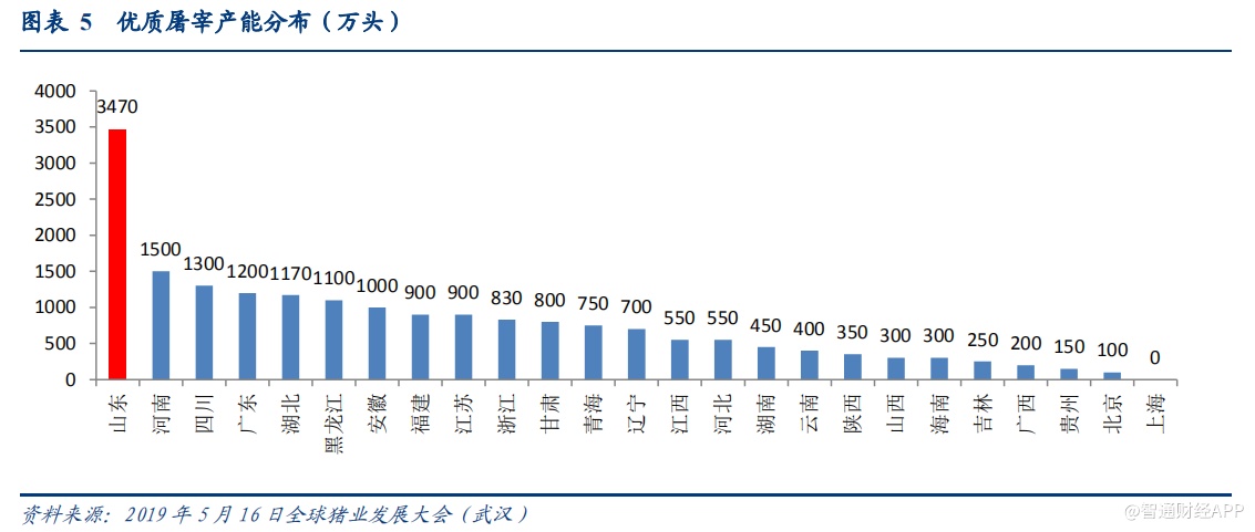 从省区分布来看,优质产能主要分布在山东、河南、四川等地。其中山东明显领先于其他区域,优质产能达 3470万头,除了金锣之外,还有相当数量日屠宰量 7000-8000 头的中等屠宰企业,这也使其成为一个主要调入生猪而调出猪肉的较为特殊样本。