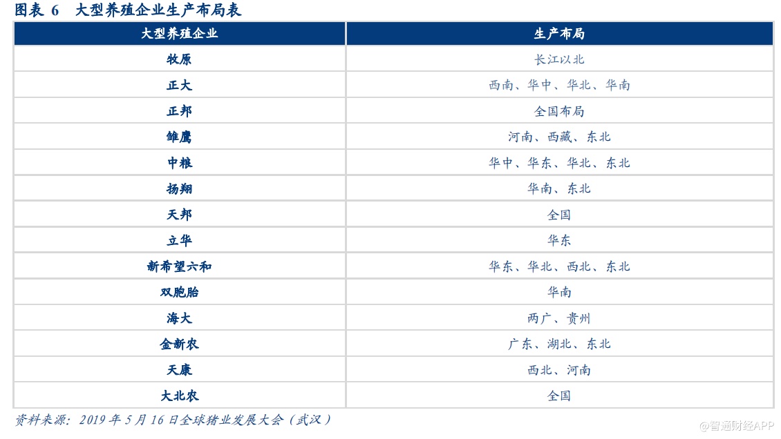 南方六省试点分区调运,生猪产业呈现三大发展趋势。目前两广是新的重灾区,由于国内没有非瘟疫苗,病毒和养猪业会共存,防控将成为常态,未来一段时间保供给成为严重挑战。2019 年 3 月广东、福建、江西、湖南、广西和海南省政府共同签订《南方六省(区)非洲猪瘟等重大动物疫病区域联系会议框架合作协议》,明确 2019 年 5 月 31 日之后,仅 6 省区域内肉猪可在本区域内流通(发生非瘟疫情省份除外);10 月 31 日后,六省区域内省与省之间禁止肉猪跨省调运;3 年内力争实现南方六省地级市与地级市之间由“调猪”转为“运肉”。温氏集团养猪事业部总裁罗总判断生猪行业将有三大发展趋势:①疫情冲击下生猪养殖格局将深度调整,行业集中度加速提升;②大中型企业和中等规模养殖户将成为未来从业主体;③长期看,屠宰业布局规划将向生猪生产区倾斜,产能与生猪养殖规模、消费区域相适应。