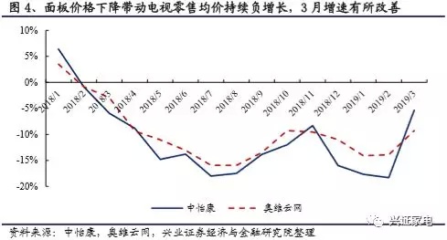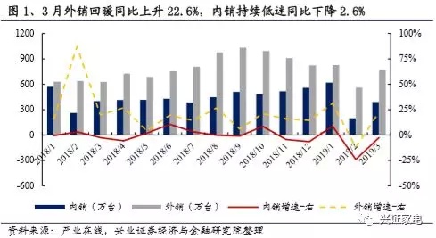 内销持续低迷,促销效用有限。企业出货端,根据产业在线数据,全国19Q1出货1208.5万台/-2.9%,3月增速-2.6%。零售端,根据中怡康数据,全国19Q1零售额、零售量、均价增速分别为-16.4%、-2.9%和-13.9%,3月零售额、零售量、均价增速分别为-5.9%、-0.6%和-5.4%。总体来说,出货端和零售端均延续前期低迷态势。均价的大幅下滑一方面来自面板价格的下跌,另一方面来自企业降价促销。不过,全国市场需求低迷背景下,降价促销效果有限,零售量继续小幅负增长,为近五年最差Q1。从最新的数据来看,五一市场依旧低迷,中怡康统计的零售额、零售量、均价增速分别为-4.8%、-1.8%和-3.1%。