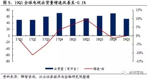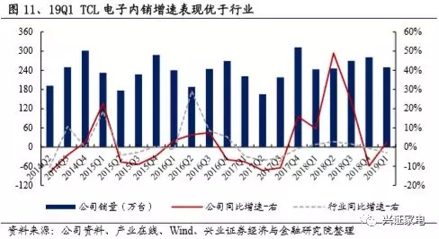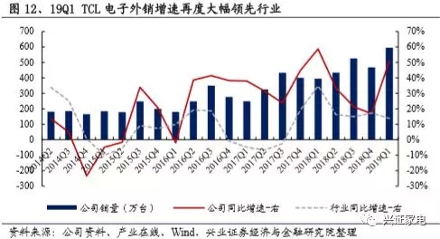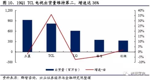 19Q1中国厂商出货增速略好于外资品牌,TCL表现亮眼。根据群智咨询数据,19Q1全球前5大电视出货商为三星、TCL、LG、海信、创维,销量/增速分别为925万台/-2%、820万台/+36%、612万台/-7%、350万台/-4%、330万台/+7%。前5大厂商中,仅有中国的TCL和创维维持增长,TCL增速甚至超过35%,表现亮眼。TCL电子的高增长主要是受益于全球化布局成效突显。近几年,TCL电子海外业务实现突破式发展,北美、新兴及欧洲各海外市场均持续实现显著增长,19Q1销量同比分别增长112.0%,39.9%及27.1%。