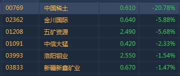 智通财经APP获悉,有色金属板块集体回落,截至13时41分,中国稀土(00769)跌20.78%,报价0.61港元。金川国际(02362)跌5.88%。五矿资源(01208)跌5.68%,盘中低见2.47港元,创近两年新低。洛阳钼业(03993)跌1.54%。