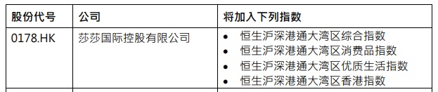智通财经APP获悉,5月21日,恒指公司公示称,莎莎国际(00178)将被纳入恒生沪深港通大湾区综合指数、恒生沪深港通大湾区消费品指数、恒生沪深港通大湾区优质生活指数、恒生沪深港通大湾区香港指数。