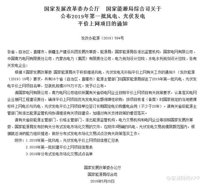 智通财经APP获悉,今日,国家发改委能源局公布2019年第一批风电、光伏发电平价上网项目名单。