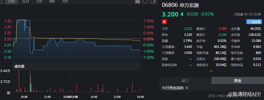 截至今日收盘,申万宏源(06806)跌0.93%,报3.2港元。