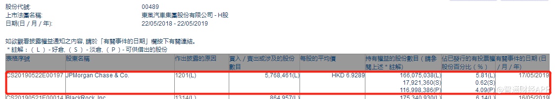 智通财经APP获悉,根据联交所资料显示,摩根大通于5月17日减持东风集团(00489)576万股,每股作价6.93港元,总值约3991.68万港元,最新持股数目约1.66亿股,最新持股比例为5.81%。
