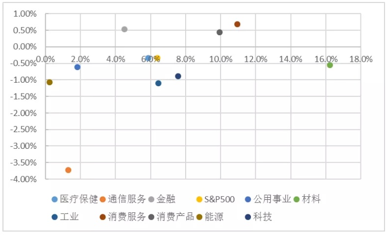 通信服务板块盈利同比下降5.7%,主要由于谷歌母公司Alphabet和脸书Facebook盈利不及预期,这两家公司都因为监管开出的巨额罚单拖累表现。对比一年前EPS13.33美元,Alphabet如今每股盈利仅为9.5美元;Facebook一年前和如今的EPS分别是1.69美元和0.85美元,盈利缩水严重。如果不考虑者这两家公司,通信服务板块其他公司总体仍保持两位数的盈利增速。除此之外,必需消费板块盈利同比下降1.4%,材料板块盈利小幅减少1.1%。