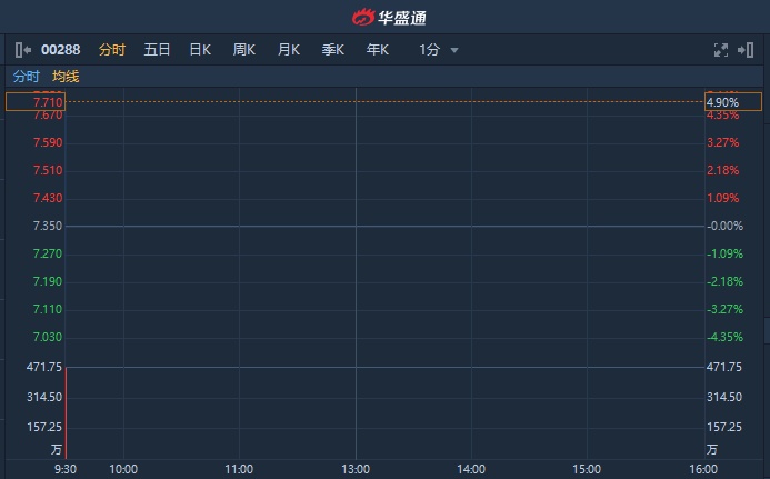 智通财经APP获悉,万洲国际(00288)早盘大幅高开,截至9时20分,涨4.9%,报7.71港元,成交额达4998.18万港元。