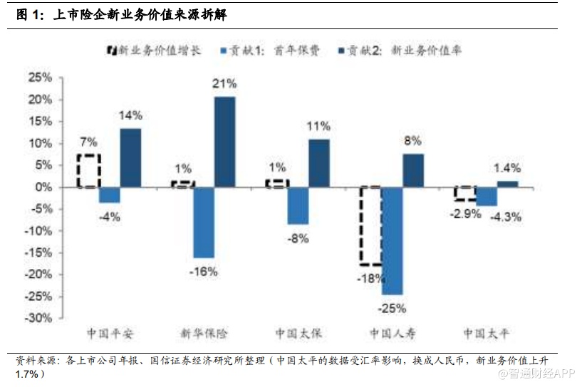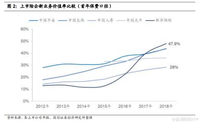 1) 首年保费纷纷同比下滑,与险企转型成效有直接关系:在监管的督促下,整个行业如火如荼的进行转型,各大上市寿险企业的新业务保费规模皆受到影响。其中中国平安和中国太保受益于转型较早,首年保费下滑幅度最低,分别为-4%和-8%;新华保险由于处于转型期,旧有的偏理财型业务占比仍然很大,所以受到较大影响,首年保费同比下滑 16%;于港股上市的中国太平,转型成效较高,首年规模下滑幅度不大,为-4.3%;而中国人寿处于转型初期,受到的影响最大,首年保费同比下滑幅度达到-25%。