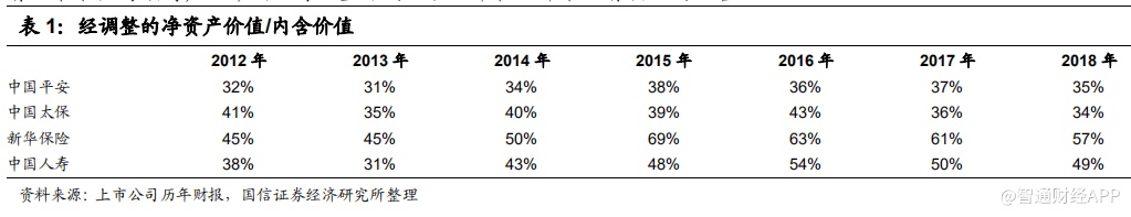 经调整的净资产价值占比指标反应了各险企的资本金利用效率。截至于 2018 年,中国平安、中国太保、新华保险、中国人寿、中国太平等寿险业务的调整后净资产占比分别为 35%、34%、57%、49%和 40%,皆比往年有所降低,资本运营效率皆有所提升。由于中国平安的寿险业务在业内率先完成转型,其存量保单业务价值占比高,即资本金利用效率明显高于同行;新华保险,因为近年来竭力转型健康险,业务结构逐渐调整,其整体业务运营效率于 2018 年改善最为显著,未来值得期待;而中国人寿,整体的运营效率在近年来亦有明显的改善。
