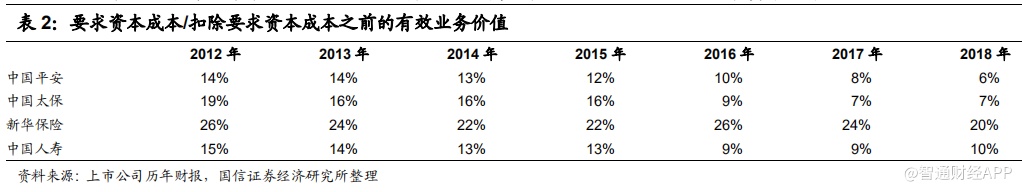 我们为了衡量寿险及健康险企业的资本运营效率,我们进一步构建了“经调整的净资产价值/内含价值”以及“要求资本成本/扣除要求资本成本之前的有效业务价值”两个指标以表示整体的资本运营效率。这里有两层含义:1)前者越高,说明上市险企的净资产相对于保险业务显得更加冗余,余下的净资产并未得到充分的利用,业务发展效率较差;2)后者指标越高,则代表存量业务的资金成本高,存量业务的盈利能力则相对较弱,后期改善空间大。