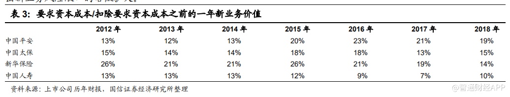 我们单独构建指标“要求资本成本/扣除要求资本成本之前的一年新业务价值”,以显示出企业新单业务的风险敞口大小,或者资本金成本。要求资本成本占比,即偿付能力成本的占比,在一定程度上可以有效比较寿险企业新业务风险敞口的指标,而新单业务的补充会逐渐改变存量业务的风险敞口,是寿险企业整体风险敞口改变的前驱指标,影响寿险企业的估值。