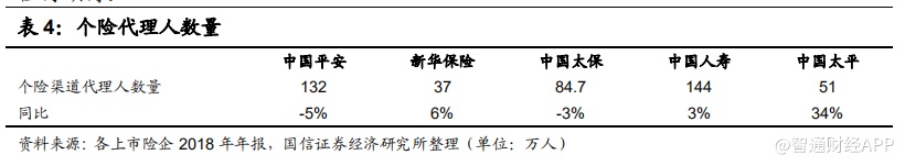 代理人销售渠道是销售保障型寿险产品的主要渠道,其代理人数量的扩张以及销售实力的提升是寿险企业业绩增速的基础。在 2018 年,各大上市寿险企业在代理人数量增长方面出现分化,其中中国平安和中国太保的月均代理人数量同比下滑,平安个险渠道月平均代理人数量达到 132 万人,同比下滑 5%,太保个险渠道代理人数量达到 84.7 万人,同比下滑 3%。新华保险、中国人寿以及中国太平的月均代理人数量保持着增长,其中中国人寿个险渠道代理人数量达到 143.9万人,同比上升 2.6%,新华个险渠道代理人数量达到 37 万人,同比上升 6%,而中国太平个险渠道代理人数量突破 51万人,同比上升 33.5%,增速为同业第一,扩张显著。就业绩增速而言,新华保险和中国太平短期内新业务增长的幅度值得期待。
