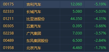 智通财经APP获悉,汽车板块今日延续回调态势,截至发稿,吉利汽车(00175)、长城汽车(02333)跌超5%,五菱汽车(00305)跌3.66%,东风集团(00489)跌2.84%。
