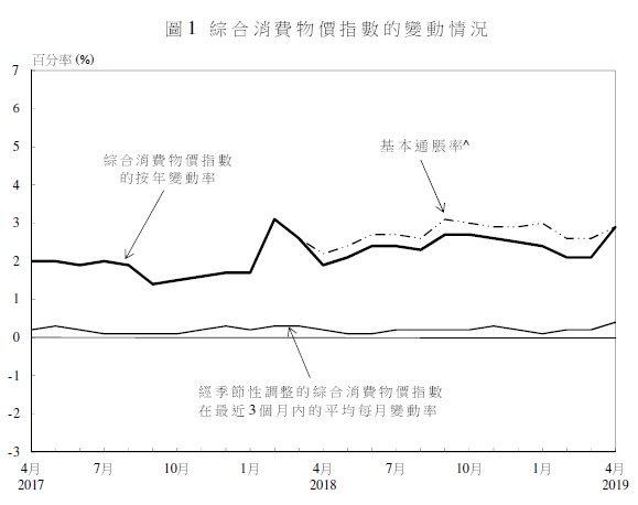 经季节性调整的综合消费物价指数,截至2019年4月止的三个月的平均每月升幅为0.4%,而截至2019年3月止的三个月的相应升幅则为0.2%。剔除所有香港政府一次性纾困措施的影响,相应的升幅为0.3%及0.2%。