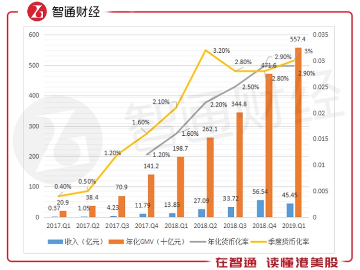单看2019年的Q1业绩并不能看出拼多多的发展情况,我们将该公司2017年Q1开始9个季度进行研究。智通财经APP观察到,该公司的年化GMV不断创新高,2019年Q1为5574亿元,9个季度复合增长率达到50.75%,而年化货币化率及季度货币化率也在逐季提高,2019年Q1分别为2.9%和3%。