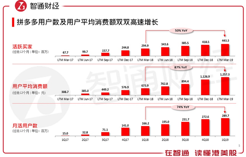 拼多多的GMV的大幅增长基于用户规模、用户粘性和平均消费额的全面综合性提升。根据该公司2019年Q1,平台年活跃买家数达4.433亿户,较去年同期增1.484亿户,同比增长超过50%,其中移动客户端平均月活用户达2.897亿户,较去年增1.235亿户,同比增长超过74%。