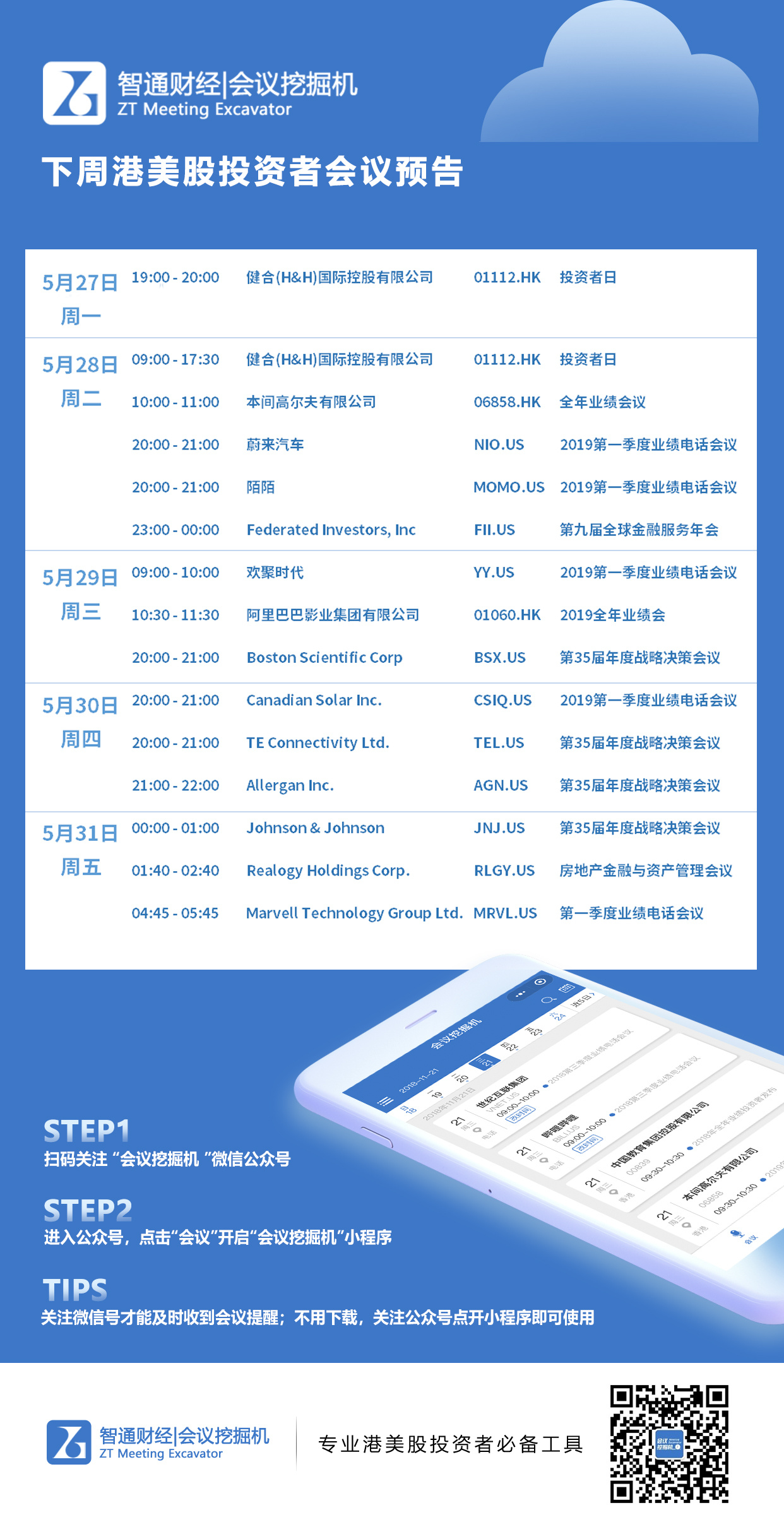 以下是智通财经“会议挖掘机”为您整理的下周(5月27日-5月31日)港美股上市公司会议日历。
