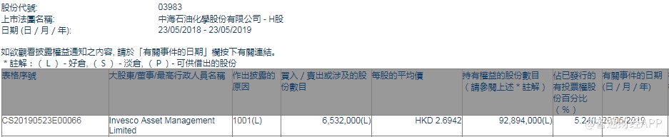智通财经APP获悉,根据联交所资料显示,景顺资产管理于5月20日增持中海石油化学(03983)653万股,每股作价2.69港元,总值约1757万港元,最新持股数目约9289万股,最新持股比例为5.24%。