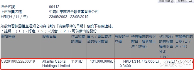 智通财经APP获悉,根据联交所资料显示,Atlantis Capital Holdings Ltd于5月17日增持中国山东高速金融(00412)1.31亿股,每股作价0.34港元,总值约4454万港元,最新持股数目约13.14亿股,最新持股比例为5.38%。